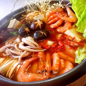 可以放入高汤,如果没有高汤,就另外烧水,加入韩式辣酱、盐、油、喜欢吃辣的加小米椒、酱油、醋等。待汤沸腾后倒入摆盘好的锅中。