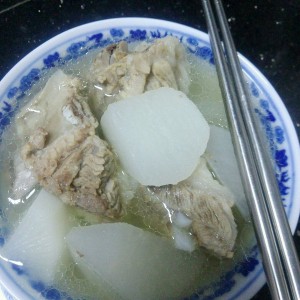 萝卜去皮,滚刀切块,放入汤锅,电压锅又40分钟,开盖加盐,调味上桌。