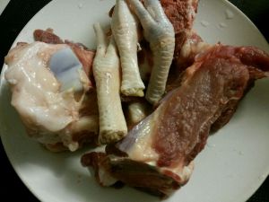 棒骨和鸡脚处理干净,棒骨卖家斩断,鸡脚剪去脚趾