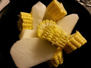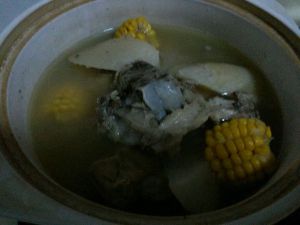 和姜,胡椒粒,水煲25分钟后加入萝卜鸡脚和玉米,煲多三十分钟关火