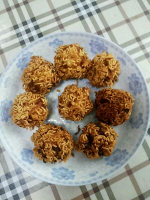 6.抓一团肉在方便面上滚一圈,捏成球状!