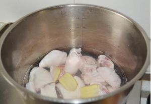 锅中冷水放入猪蹄和生姜大火煮开,将猪蹄焯水,洗去血沫捞出。