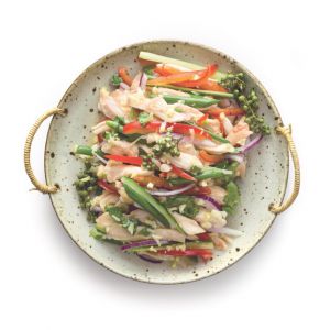 将800g藤椒风味手撕鸡放入烤箱,以200℃上下火烤20分钟。