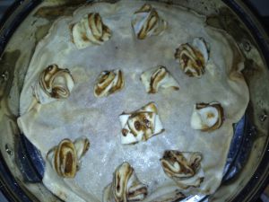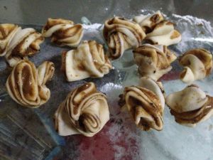 面发好后赶成饼 图上花生酱,然后撒上花生碎。在撒点黑芝麻,卷起来,切开,凝成花卷的形状