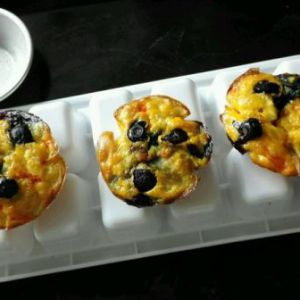 分别倒入鸡蛋液,慢慢搅拌均匀,放入蓝莓,也可以放上奶酪,味道更好,大人吃的话表面可以撒上调料