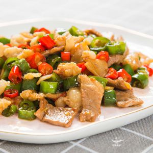 首先将猪后腿肉洗净去皮,切下一些肥肉部分,留下备用,其余切成薄皮;同时小米椒、绿尖椒、蒜切成片备用。接着讲切好的后腿肉片。加入少许料酒、酱油、蚝油、水腌制15分钟。