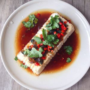 把皮蛋切成小粒,红椒切成小粒,摆放在豆腐上,用小勺子勺调好的料汁淋在红椒上。