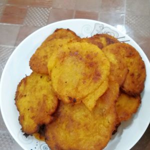 就是把南瓜蒸熟,捏碎,爸爸说捏碎以后要倒掉一些水,那样味道会更浓一点。然后放一定的面粉,在面粉里加南瓜,加糖,拌拌拌。