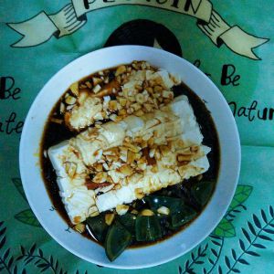豆腐倒进盘里,皮蛋切块,调好的汁倒入,放入冰箱冷藏,吃饭之前拿粗来。