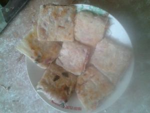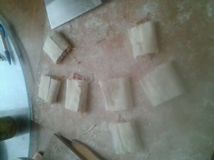 买的现成萝卜卷皮,将馅子铺平,卷起来。用刀改成需要的大小。