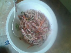 萝卜,胡萝卜切成萝卜丝。葱,姜,豆腐切成丁,粉丝用刀改短。