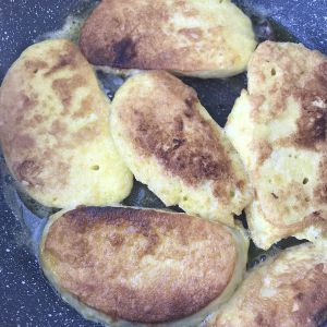 放锅里煎,熟了、出锅即可。(我还是爱吃不粘蛋液的,那样子的特别脆。)