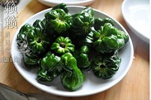 将根据个人口味用净锅干煸或快速油炸的方式使青椒脱水起皱,生成“虎皮”;炒锅烧热,注入少许油,油温起来后下蒜末煸香;
