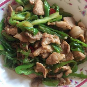 热锅倒肉,加入腌制好的肉片翻炒均匀,加入切好的蒜炒出香味,加入一小勺老抽翻炒一会,然后放入切好的青椒。