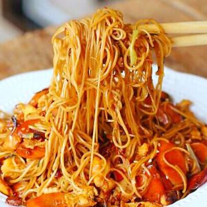 加入面条拌炒,用筷子帮助,让面条和炒料充分融合。调味:老抽、生抽、糖。