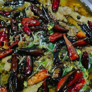 4.锅中烧食用油,可以适量比平时多一些!待油热后,放干红辣椒,和花椒,炸到透红,然后,把炸好的红干辣椒和花椒一起捞出!