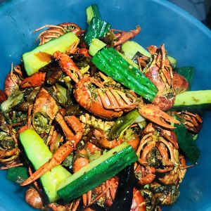倒入沥干水分的小龙虾,不停翻炒,我炒了5.6分钟