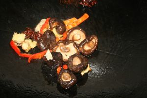 转中火,下冬菇翻炒上色,加入酱油,老抽蘑菇精;