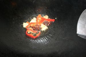 起锅热油,小火爆香小米椒、八角、姜片,下白糖,哈哈,香辣的味道出来啦,小心呛着哈