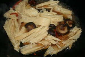 下腐竹翻炒加入一小碗水,水开后,盖上盖子焖上3-5分钟