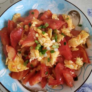 锅内放油,放入西红柿,放少许盐,糖,翻炒出汤汁后放入鸡蛋,出锅后撒香葱