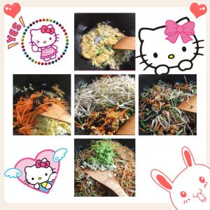 加入豆芽豆角一起翻炒,加味达美酱油和白糖少许继续炒