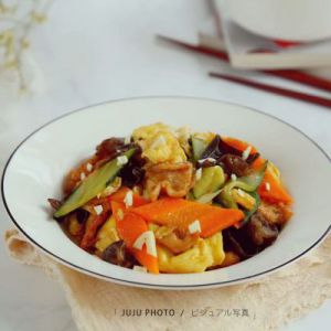 放入胡萝卜、木耳和炒好的肉片翻炒片刻