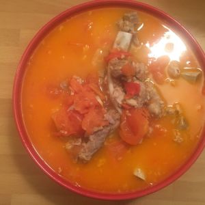 在番茄汤中倒入刚刚压的八层熟的肋排和肉汤