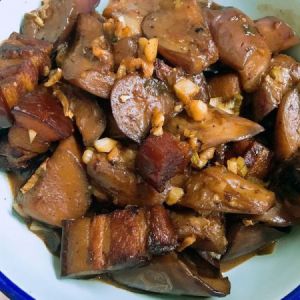 热油下入一半的蒜末,煸香,到茄子,炒至变色软了,倒入备好的料汁,加小半碗水,盖盖焖煮片刻。