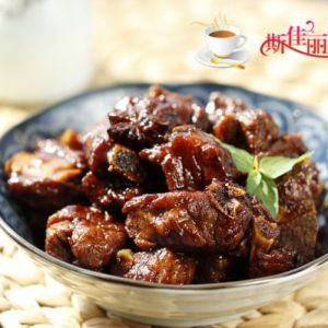 翻炒至排骨上色后加入适量的水加盖炖煮十五分钟;