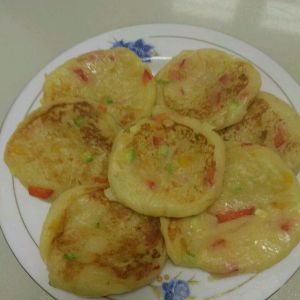 蒸熟的土豆压成泥,加适量面粉、盐、胡椒粉,加入甜椒西葫芦丁。
