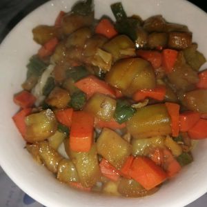 大蒜,线椒,胡萝卜,油热后下锅翻炒,胡萝卜见热油更有营养,而且比茄子难熟一些,所以先炒。