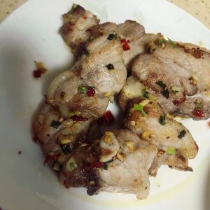 放入葱姜蒜辣椒末开始煸炒…随后放入排骨…翻炒几下,放入适量椒盐,即可出锅