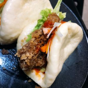 一片生菜,一点葱白,一点胡萝卜,一块粉蒸肉夹入荷叶包中,撒点辣椒酱,完美!