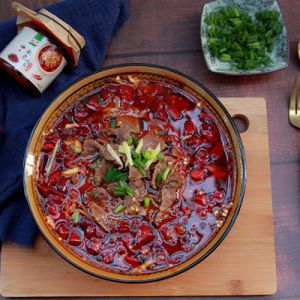 锅中加入400毫升水,加两勺水煮肉片调味料,一勺鲜鸡精,适量的生抽,煮开;