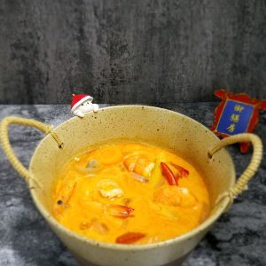 锅烧热不放油,把虾头放进去干煎一会,加入开水,加冬阴功酱,虾酱,菇啊蕃茄啊,香茅柠檬叶南姜红椒,二分之一椰浆,开水加到与食材平齐,一起煮开