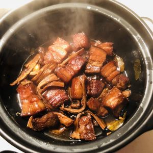 换锅炒糖色,下肉块,炒两遍,下料酒老抽生抽盐,加生姜片大料加250ml啤酒,盖锅盖煮沸后转小火闷煮一小时