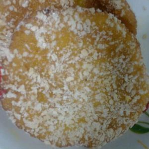 揪面团小块儿揉圆,手拍成饼状,粘上面包糠,小火炸,南瓜膨胀用铲子按一下反面也要炸,金黄色就熟了,起锅