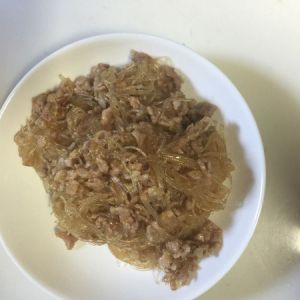 油锅加热,把肉末炒到变色,放入泡开的粉丝,快速翻炒,注意不要让粉丝粘成一团