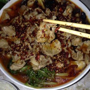 酱包 倒入锅中,加水,煮开,将肉片煮熟,将肉片放倒之前的菜上,把酱汁倒入大碗中(我直接用的水煮肉片料包,淀粉,酱包,辣椒粉都有,也可以用豆瓣酱炒酱汁)
