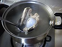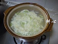 一手将蛋液慢慢倒入砂锅中,一手用筷子慢慢拌匀。