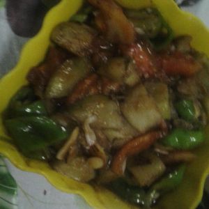 西红柿超出少于汁实,倒入过了油的茄子块,然后加入盐味精,鸡精,白糖,翻炒一分钟即可出锅!