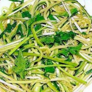 将切好的香菜段、绿辣椒丝和黄瓜丝混合,调入盐、白砂糖和芝麻香油拌匀腌制10分钟,即可食用。