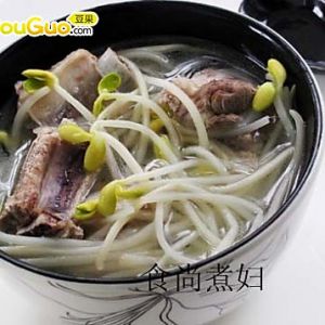 排骨切小块,放沸水中煮2分钟捞起。黄豆芽也用沸水烫过捞起。