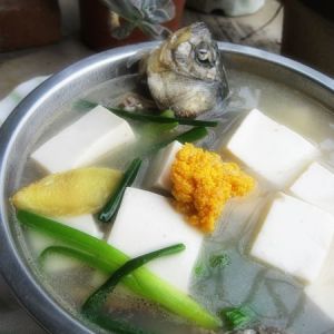 锅加热,倒入适量的油,用姜片把油撒开,小火慢慢把鲫鱼煎至两面金黄,把火调至最大,加入适量的清水烧开,倒入嫩豆腐再次烧开转中小火煮20分钟左右,加入适量的食盐、葱花即可