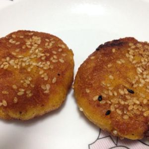 把做好的南瓜饼放入平底锅内,煎到两面金黄。