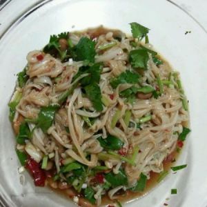 将水烧开,放入金针菇煮3-5分钟,捞起沥干水分放入碗中,趁热放入蒜末拌匀。