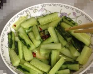 倒掉腌制出的水,把油烧热加入蒜香味出来后直接倒入黄瓜上,干辣椒要被油充分浇到,加点鸡精,拌好就OK了