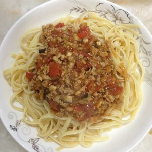 意大利面煮10分钟,捞出。锅内放黄油,加入洋葱,香菇炒香加蕃茄和肉丁 酱翻炒 加入水 煮一下 收汁前 加点老抽和椒盐 倒在面上就好啦