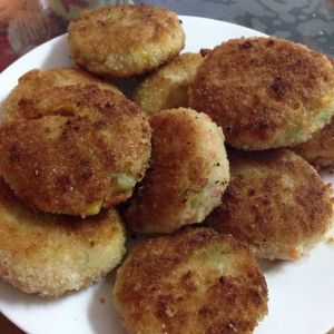 准备好面粉,蛋液,面包糠。把之前混好整体捏成饼状,并依次裹上面粉蛋液面包糠。然后热油下锅,其间多翻翻面,防止糊掉。